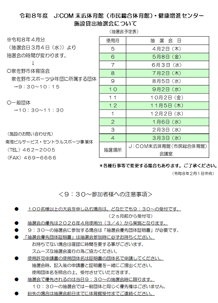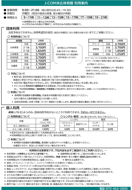 団体利用など、その他の利用についてはJ:COM末広体育館(072-462-2005)までお問い合わせください。